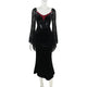Step into timeless allure with Ravenna by Authentic Goth, a mid-calf velvet dress that brings out gothic sophistication. Crafted in rich, stretchable velvet for a flattering slim fit, this dress accentuates your silhouette with its graceful trumpet shape. The plunging V-neckline and intricate lace details create a mysterious, refined look, while butterfly sleeves add a soft, ethereal touch. Ideal for autumn and winter, Ravenna’s empire waistline and full-length sleeves make it a perfect blend of comfort and elegance. Slide into Ravenna and make a statement with this vintage-inspired gothic piece.