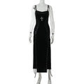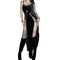 The long flowing cut creates movement and drama, while the fitted bodice shapes your figure with dark elegance. Every step reveals flashes of skin, contrast, and confidence.