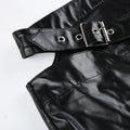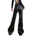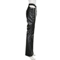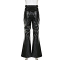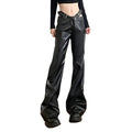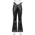 High-waist faux-leather flares with a statement double-belt and sleek Y2K-grunge silhouette. The sculpted hipline and long drape lengthen the legs, while the soft lined interior keeps them wearable from day to night. Pair with a cropped knit, chains and heavy boots for unapologetic mall-goth energy—or dress up with a corset and trench for dark-femme polish.